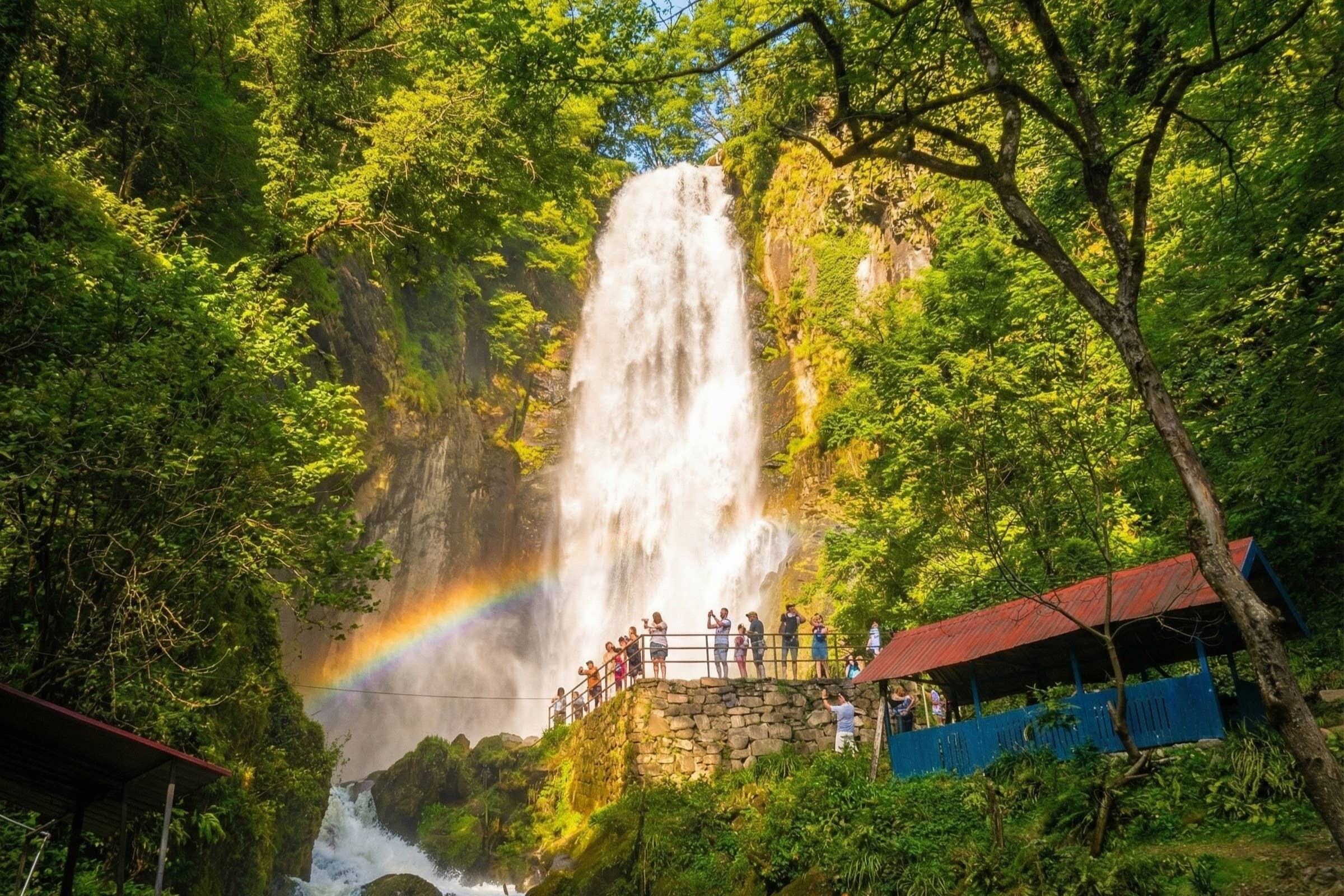 Самый высокий водопад Аджарии. Вода живописным и мощным каскадом стекает в каменную чашу с высоты более чем 30 метров.